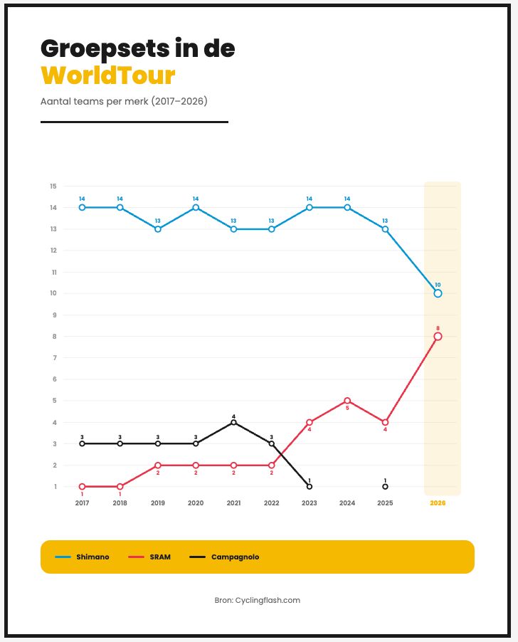 For years, Shimano was the undisputed king in both the WorldTour and the Women's WorldTour, but SRAM could very well surpass Shimano in the coming years. By 2026, just over half of the men's teams will ride Shimano. In the Women's WorldTour, eight of the fourteen teams already ride SRAM.