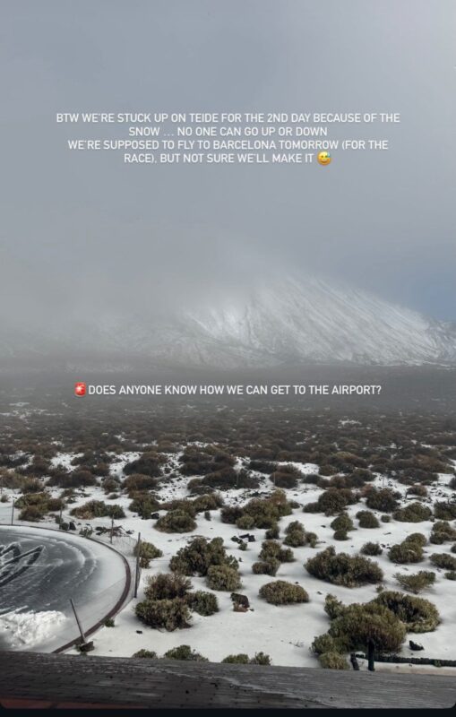 The Canary Islands are well known for their excellent training conditions. The Teide has long been regarded as the ideal location for a high-altitude training camp. Evenepoel is currently staying there with his wife Oumi Rayane. She shared on Instagram Friday afternoon that the couple is normally scheduled to fly to Barcelona on Saturday evening for the start of the Tour of Catalonia, but they haven’t been able to get down the mountain for two days.