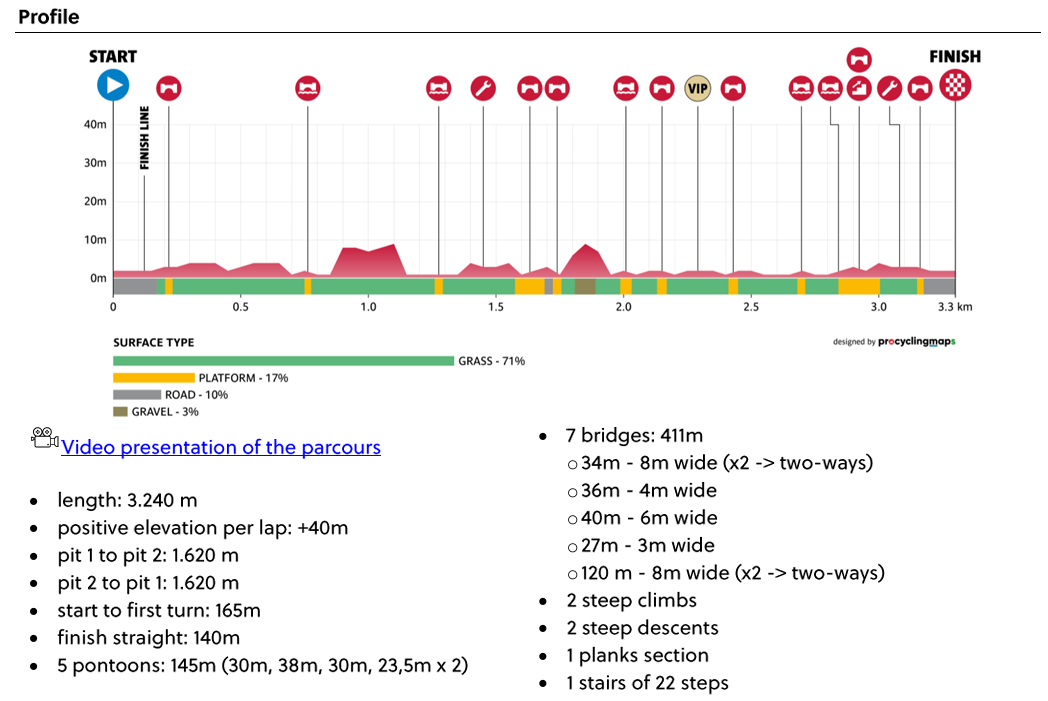 Since then, course builder Kurt Vernimmen has worked to combine the best elements. "Since last year, we reversed the direction of the course and did everything to improve the flow of spectators. We are now doing even better with an extended course, featuring seven pontoons and five rider bridges. The most spectacular bridge is a total of 200 meters long and built with two levels. Riders can see their competitors as they cross each other, unseen."