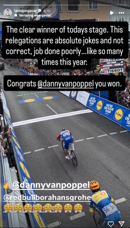 "The clear winner of todays stage" Pogacar begins his post on social media with a photo of the finish at the Deutschland Tour. "This regelations are absolute jokes and not correct, job done poorly ...like so many times this year. Congrats, Danny, you won."