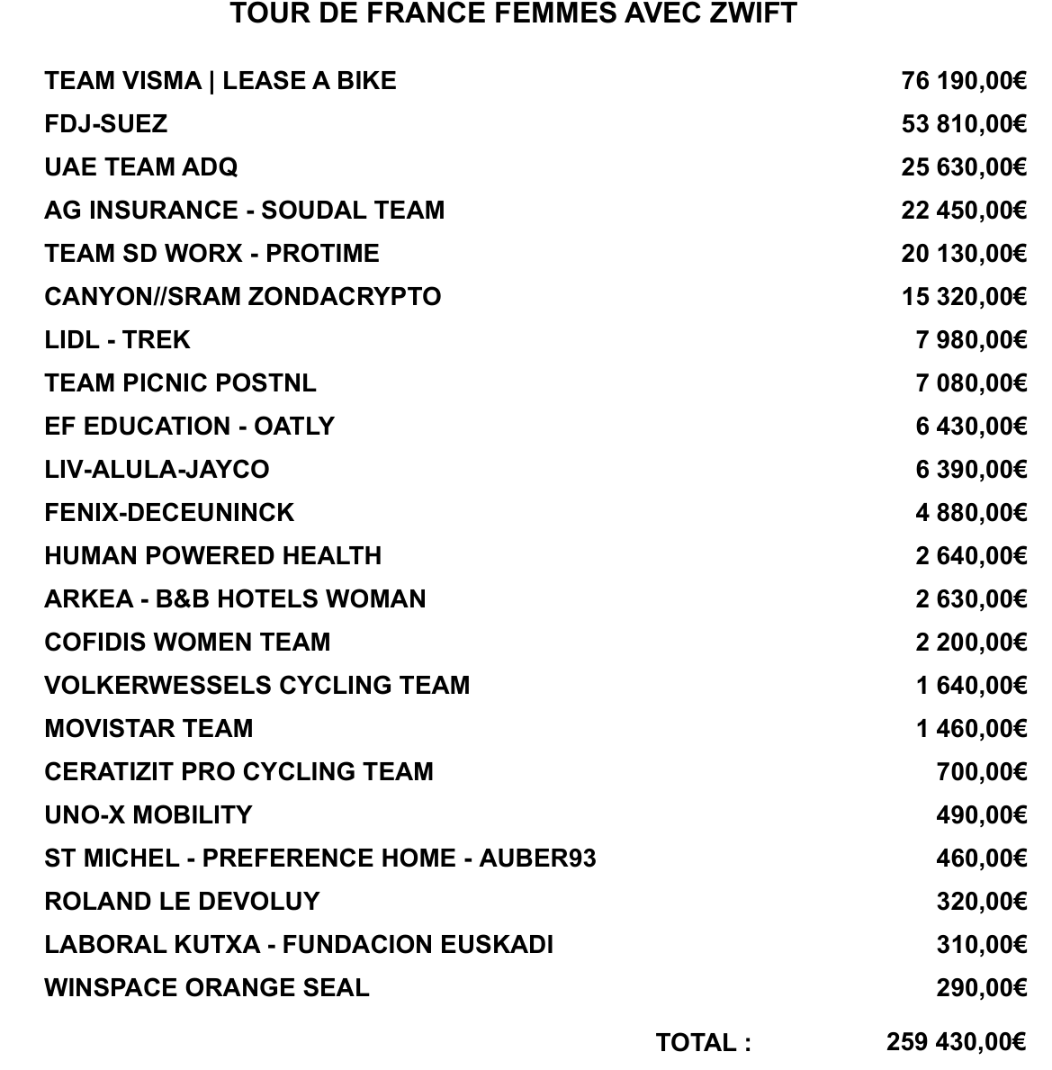 At the team level, Visma | Lease a Bike made the best haul. Besides the money for Ferrand-Prévot's overall win, they collected around €26,000 more, while FDJ-SUEZ had to make do with almost €54,000. Winspace Orange Seal fared the worst, with barely €290.