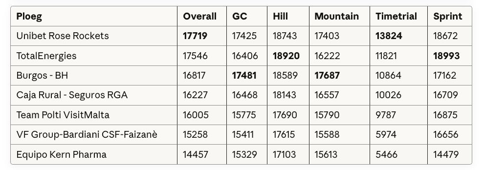 In the WielerFlits Podcast, our reporters Maxim Horssels and Youri IJnsen discuss the prospects of the French ProTeam with Dutch roots. “We compared the seven ProTeams that could get a wildcard based on their ratings on Cyclingflash,” explains Horssels. “Teams are scored based on the individual strength of their riders. We applied an algorithm where the value of the top riders per team carries more weight, and this can be broken down by specialization. This gives a clear overview. Looking at the overall score, Unibet Rose Rockets comes out on top. Just below them is TotalEnergies, the two teams most likely to claim a spot.”